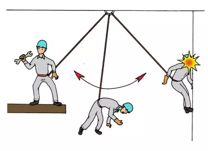 如果你系掛安全帶時,扣點不是自己位置正上方的話,發生墜落時將在空中出現擺動現象,并有可能撞到其它物體而造成傷害。所以扣掛時一定要選擇好扣點,以避免發生這種“鐘擺效應”。