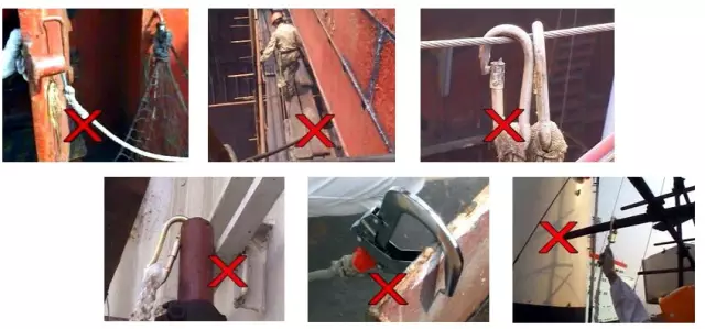 不能把掛鉤扣在可以活動的物件上;不能把安全繩拖在地上走;不能把安全帶系在物件的開口處(自由端);不能把掛鉤扣搭在物件的邊緣等。