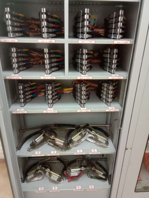 上面一組安全工具柜的存儲則是簡單暴力,兩層接地線,分別由支架固定,其中低層兩邊也分別放兩排。整體看起來整體規(guī)范,具有較強(qiáng)的視覺沖擊。