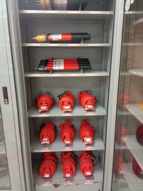 如上圖,安全工具柜共分為5個橫隔層,其中上面兩層存儲個人保安線,中間有個豎隔層。下面兩層是用于存放腳扣所用。中間一層本為自由使用,現(xiàn)也根據(jù)實際需求用于存儲個人保安線。細(xì)心的人可以看到在安全工器具前面都貼有標(biāo)簽,包含產(chǎn)品的名稱、編號、數(shù)量等。